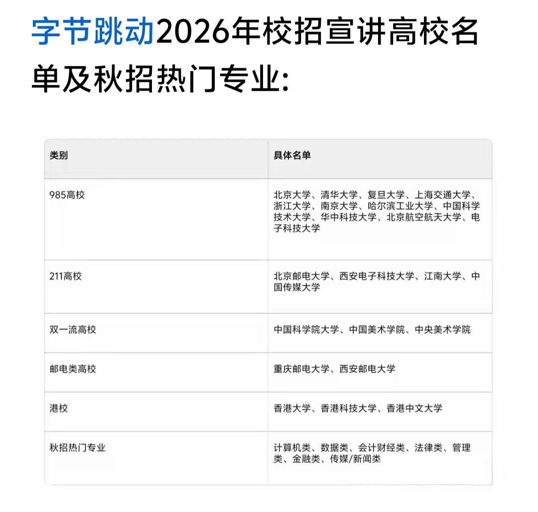 秋招的热门专业包括:计算机、大数据、会计财经、法律类、管理类、金融类以及传媒和新闻类。后者在别的地方可能是冷门专业,但对于字节来说,这个专业的人才可是刚需,看校招院校就能看出,多所优质艺术类院校榜上有名。