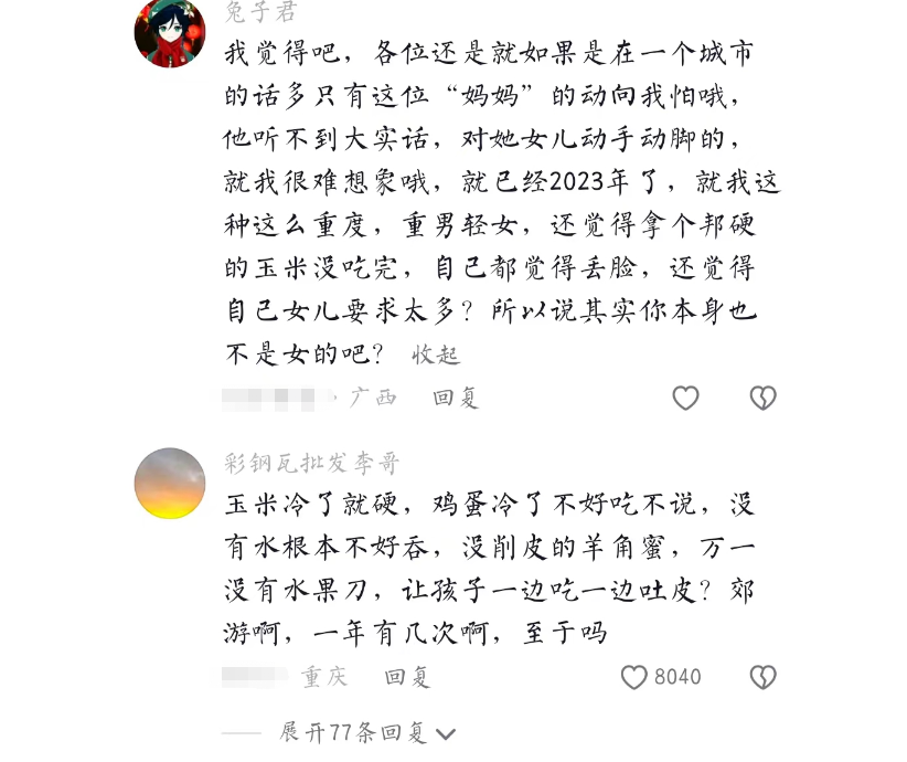 即便只能准备出来这样的食物,家长只要想花心思,总能照顾到孩子的感受,比如这份玉米和水煮蛋,评论区网友的建议就非常中肯:这两样食物冷了就不好吃了,哪怕考虑不到分享的层面,至少给孩子带一个保温饭盒吧,而不是直接套在塑料袋里。