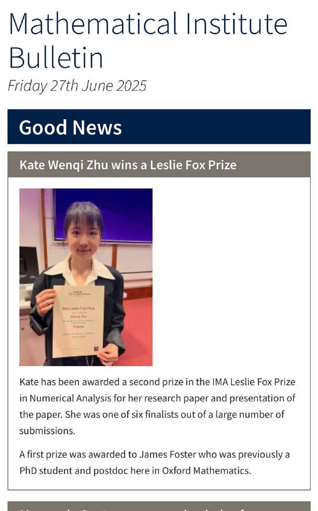 不久前,牛津大学数学在读博士生朱雯琪斩获全球数学大奖Leslie Fox Prize的新闻引发广泛关注。