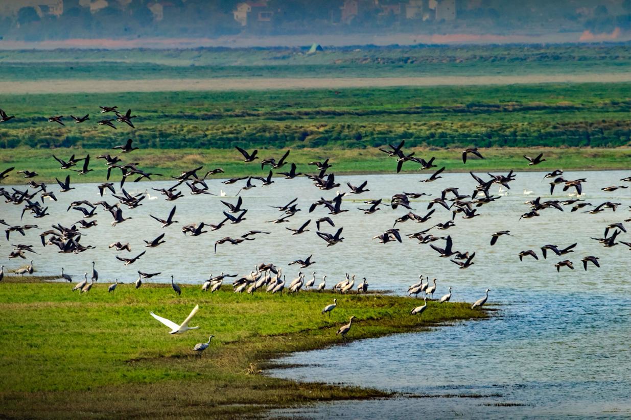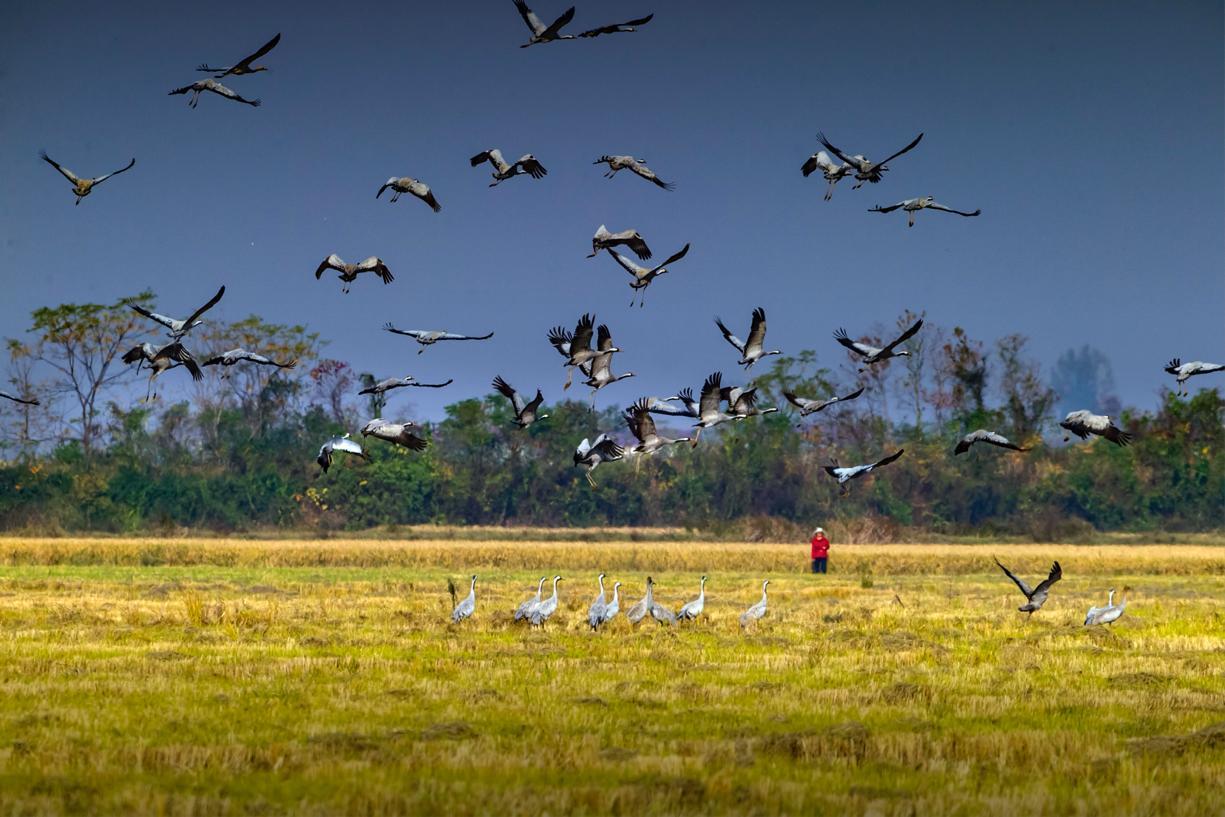 据统计,在众多候鸟中,全球95%以上的白鹤、80%以上的东方白鹳、70%以上的白枕鹤都选择在此越冬,使鄱阳湖成为名副其实的“候鸟国际机场”。