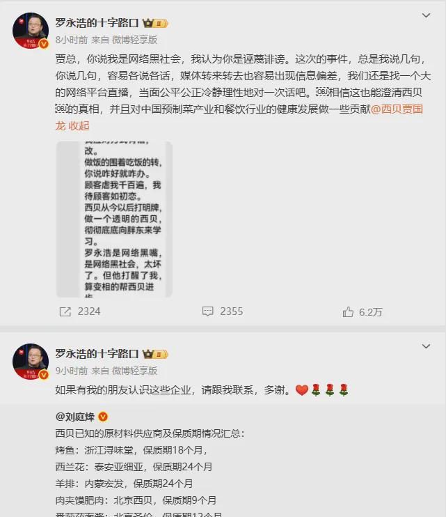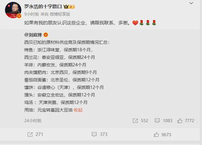 随后,昨日晚间,罗永浩还在微博发起了征集西贝原材料供应商及保质期线索的动态。